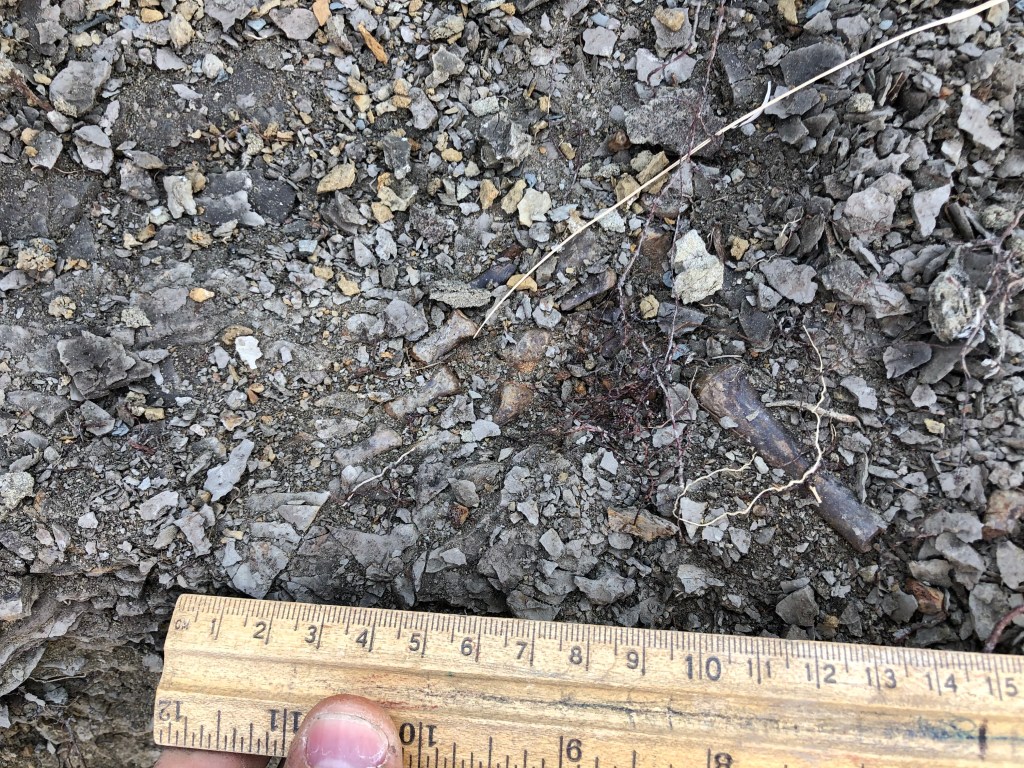 This skeleton is between 35-40% complete and is comprised of several dorsal and caudal vertebrae with intact neural arches and transverse processes, incomplete bones from all four limbs including a humerus and femurs, dozens of ribs, and several elements making up the pectoral and pelvic girdles. Numerous gastralia as well as a near complete hind foot were found in situ upon examination of the shale horizon from which the bones had eroded out. More fieldwork is needed to try and recover cranial material to affirm an accurate taxonomic identification of this specimen.