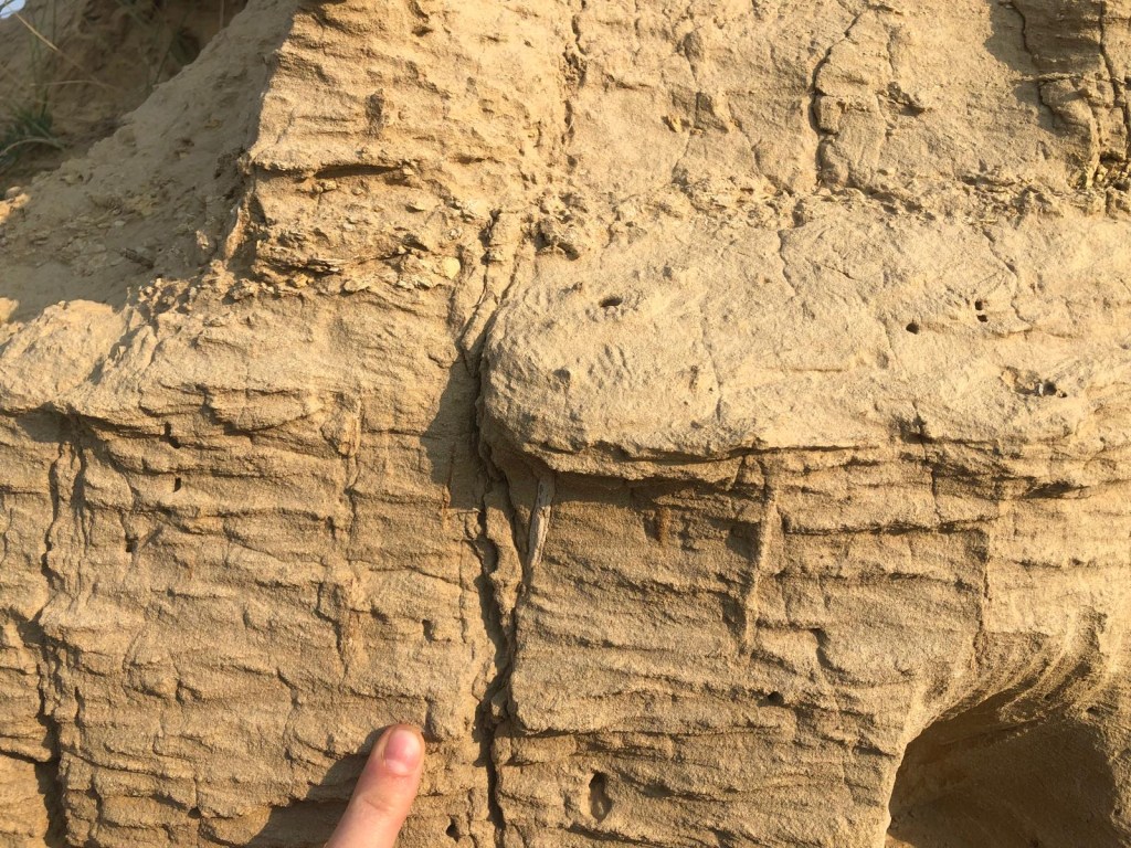 Skolithos isp. in a crossbedded sandstone fluvial channel deposit in the buff facies of the Upper Ravenscrag Formation in southwestern Saskatchewan. Photo provided by Mollie Black