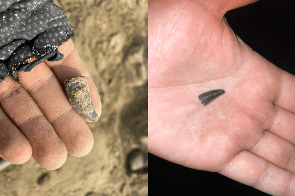 Teeth found at the Clifford quarry; Right, T. rex tooth; Left, Borealosuchus tooth. Photos by Jack Milligan