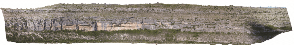 Panoramic photograph of an outcrop from the Del Norte area, Devils River State Natural Area, Texas. This outcrop shows the more proximal shallow-water platform facies & architecture of the basin. The awarded research will focus on more distal portions of this same basin. (photo by Charlie Zheng)