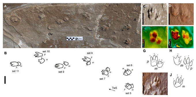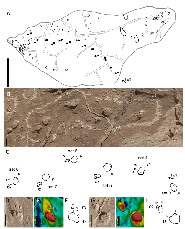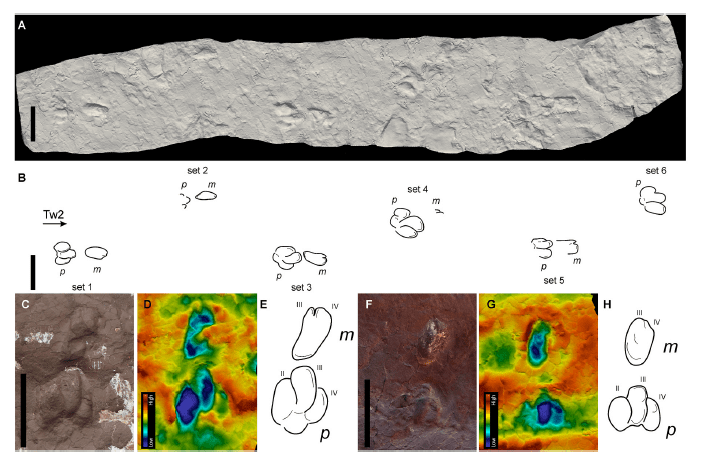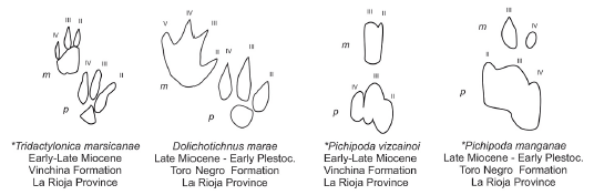 Pichipoda is a novel ichnogenus that has a didactyl to monodactyl manus and tridactyl mesaxonic pes impressions with robust digits with blunt tips. Two ichnospecies are assigned to Pichipoda, including P. manganae and P. vizcainoi. P. manganae (P. manganaei) is the largest ichnospecies of Pichipoda and has a didactyl manus, and the manus of P. vizcainoi shows an almost monodactyl morphology. Tridactylonicha marsicanae is another novel ichnogenera and ichnospecies, described by a tridactyl to didactyl paraxonic manus and tridactyl mesaxonic pes impression with long, slender, and pointed tips of the toe impressions. Dolichotichnus marae has tetradactyl paraxonic manus and tridactyl mesaxonic pes impressions.